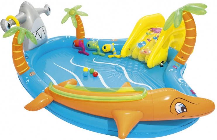 Dit Bestway speelbad met zeedieren en palmbomen thema is voorzien van een opblaasbare glijbaan en verschillende losse en vaste zeedierenvriendjes.