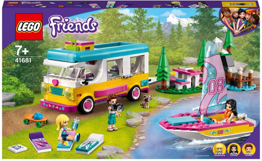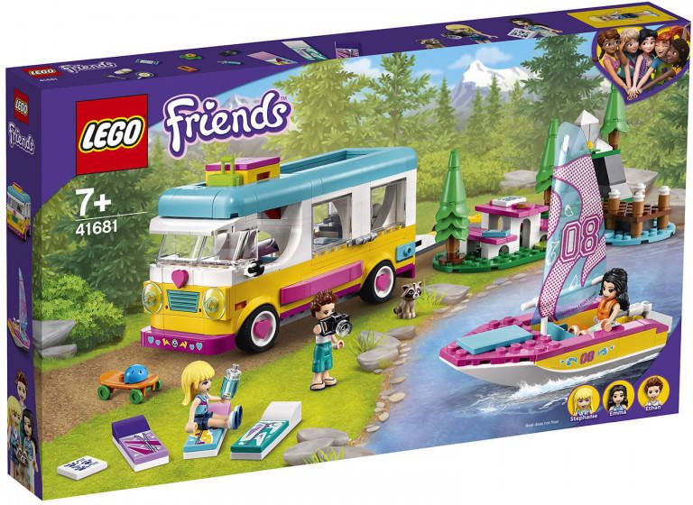 Laat kleine bouwers hun liefde voor de natuur verkennen met LEGO Friends Camper Van en Zeilboot (41681) camping bouwset. Deze LEGO Vrienden avonturen set zit boordevol functies, zodat kinderen hun creativiteit de vrije loop kunnen laten tijdens uren van creatief natuurspel.De kleurrijke speelgoedcamper zit boordevol details voor kinderen om te ontdekken en heeft een dakkoffer vol accessoires om uit te pakken. Het voordak is afneembaar voor een gemakkelijke toegang tot de cabine, en het hoofddak is scharnierend zodat kinderen de slaapzakken gemakkelijk kunnen verwijderen voor een nacht onder de sterren. De LEGO Friends boot heeft beweegbare onderdelen voor realistische zeilavonturen en er zijn een mooi meer en bergtafereel waar kinderen de camper kunnen parkeren. Er is ook een wasbeer dierfiguur om mee bevriend te raken.Help kleine bouwers hun passies te ontdekken met LEGO Friends-speelsets. Ze worden geleverd met herkenbare personages en dierenvriendjes die hen vergezellen op hun fantasierijke avonturen.Het kampeerwagen speelgoed meet meer dan 3 in. (8 cm) hoog, 6 in. (16 cm) lang en 2 in. (7 cm) breed. De boot speelgoed meet meer dan 4 in. (11 cm) hoog, 4 in. (11 cm) lang en 1 in. (4 cm) breed.Bevat 487 stuks.Kenmerken:Bevat een speelgoedcamper, een zeilboot, een meer met een aanlegsteiger en een picknicktafereel in de bergen om LEGO Friends zomercaravanavonturen te spelenHet dak van de bestelwagen is scharnierend voor een gemakkelijke toegang tot de keuken, terwijl de boot van de trailer kan worden losgekoppeld en een beweegbaar zeil en roer heeftDeze LEGO Friends kampeeravonturenset wordt geleverd met Stephanie, Emma en Ethan minipoppetjes, een wasbeer speelgoeddierfiguurDe accessoires omvatten bagage op het dak, 3 zonnematrassen', een waterfles, een skateboard, helm, telefoon, GPS, camera en een kofferVerder zijn er een bordspeltegel, reddingsvesten, picknicktafel en een koekenpan met een gebakken ei, het inspireert tot creatief spelenKijk ook eens naar andere LEGO Friends sets: Forest Waterfall (41677), Forest House (41679) en Forest Horseback Riding Centre (41683)Leeftijd: 6+Aantal stukken: 487.