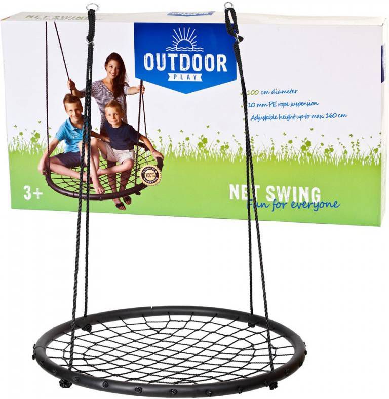 Deze Outdoor Play Net Swing met een diameter van 100cm is geschikt voor kinderen vanaf 3 jaar, met een maximale belastbaarheid tot 100kg. De Net Swing is een leuk alternatief voor de traditionele schommel. Op de Net Swing kun je staan, liggen of in elke andere gewenste houding schommelen. De Net Swing is een leuk cadeau voor je zoon of dochter om het schommelen verder te ontwikkelen. KwaliteitDe Net Swing is gemaakt van 10mm dik touw en een 1,1 dik stalen frame. Dit frame is beschermd met een acrylrubberlaag zodat deze comfortabel aanvoelt. Om te voorkomen dat je schommel te hoog of te laag komt te hangen, is het touw verstelbaar tot maximaal 160 centimeter. Hierdoor kun je zelf geheel naar eigen wens de meest perfecte swing creëren. MontageAlle belangrijke onderdelen, zoals uiteraard de swing zelf en het touw worden meegeleverd. Je hoeft de swing alleen aan het frame van de schommel te bevestigen en je kinderen kunnen gelijk beginnen met spelen!.