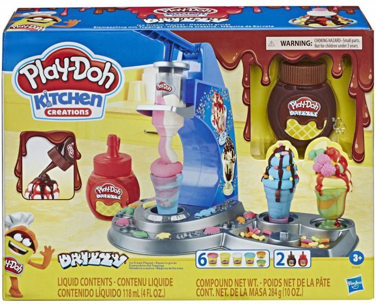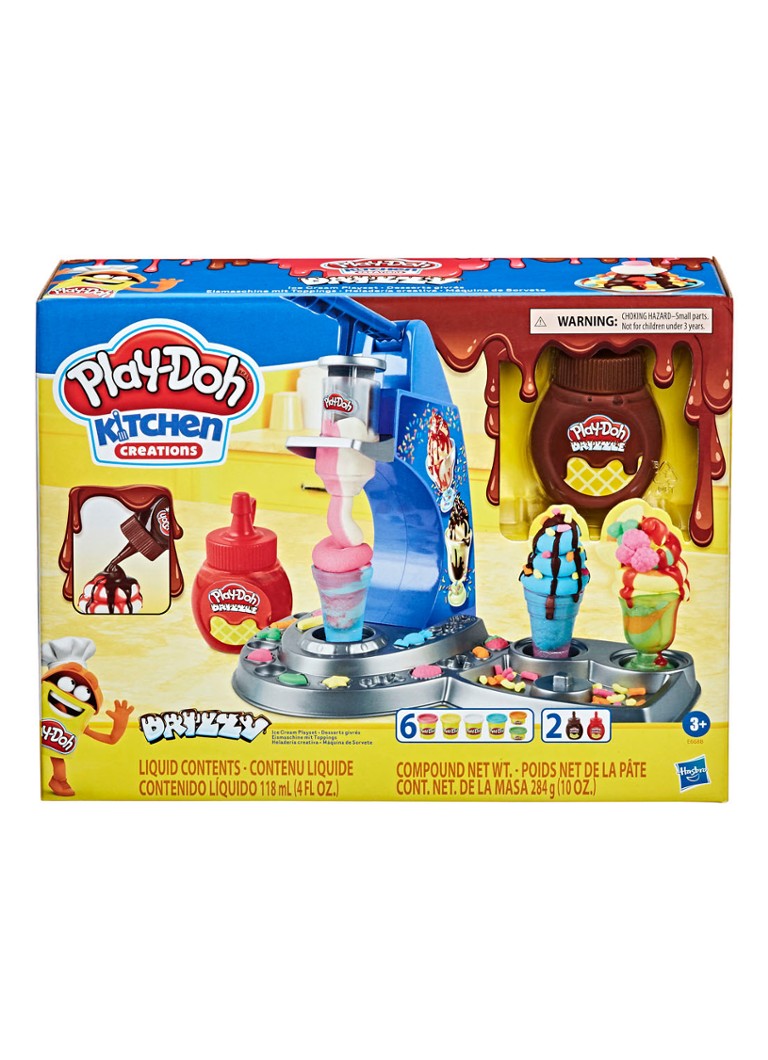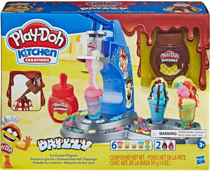 Drizzle a crazy candy coating on your Play-Doh ice cream creations! For the first time ever, this toy ice cream set comes with Play-Doh Drizzle compound a pretend syrup that turns into a pretend candy shell when you drizzle it on top of regular Play-Doh compound. It looks almost like make-believe chocolate and silly strawberry, but it's a treat for the eyes only! The Play-Doh ice cream maker is easy and fun to use: load some regular Play-Doh compound and press the handle to create colorful Play-Doh sundaes and cones. Squeeze some drizzle on top with the 2 bottles of Play-Doh Drizzle and add fun Play-Doh sprinkles and candies to decorate. This ice cream toy can be a great gift for kids 3 years and up, or just a fun arts and crafts activity! Includes: Unassembled Playset Sprinkle Maker 3 Cones 2 Dishes Spoon 2 Creation Cards Instructions 2 Bottles of Play-Doh Drizzle Compound 6 Cans of Play-Doh Brand Modeling Compound (net weight 14 oz/397 g).