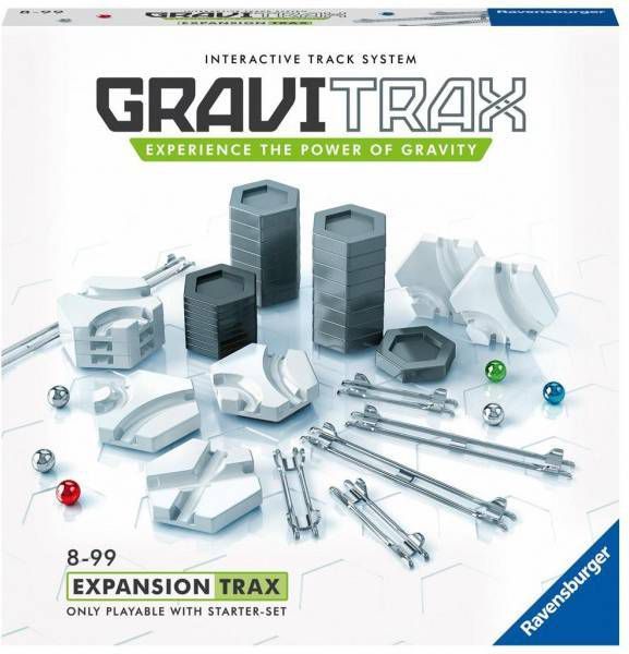 De GraviTrax Tracks voor het interactieve kogelbaansysteem van Ravensburger. Verleng je banen! Met deze set breng je je kogelbaanwereld naar een nieuw level. Combineer de verticale stukjes, bochten en rails met jouw GraviTrax® Starter-Set voor nog meer actie in de kogelbaan. Hoe lang kun jij je kogels laten rollen? Verbreek je je persoonlijke record? Met de talrijke uitbreidings-sets zoals deze Tracks wordt het vrije bouwen en construeren van het interactieve kogelbaansysteem GraviTrax® elke keer nog interessanter en spannender! Meer mogelijkheden meer plezier! Let op: bevat kleine kogel(s), niet geschikt voor kinderen onder de 3 jaar ivm verstikkingsgevaar.