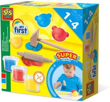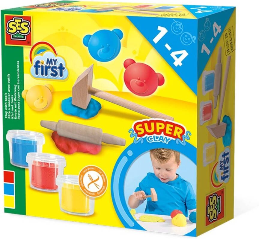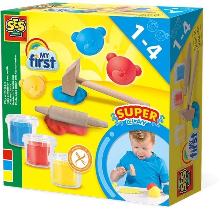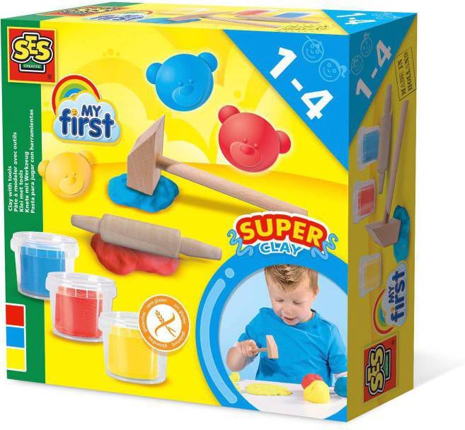 My First is een productlijn speciaal voor de allerkleinste creatievelingen. De producten binnen deze lijn zijn ergonomisch, extreem veilig, hypoallergeen en glutenvrij. /Met de kleiproducten van SES zit je altijd goed. Deze set bevat 3 vrolijke kleuren klei en klei gereedschap. Je kunt met de hamer en roller je creativiteit de vrije loop laten. Wat ga jij maken?/De My First klei van SES is mooi, makkelijk en lang bruikbaar door de hersluitbare verpakking. Geschikt voor kinderen vanaf 12 maanden. Details: Inhoud: Drie potjes klei a 90 gram in de kleuren geel, rood en blauw, hamertje, deegroller Materiaal: Plastic, klei Afmetingen: 20 x 6 x 20 cm Leeftijd: vanaf 12 maanden.