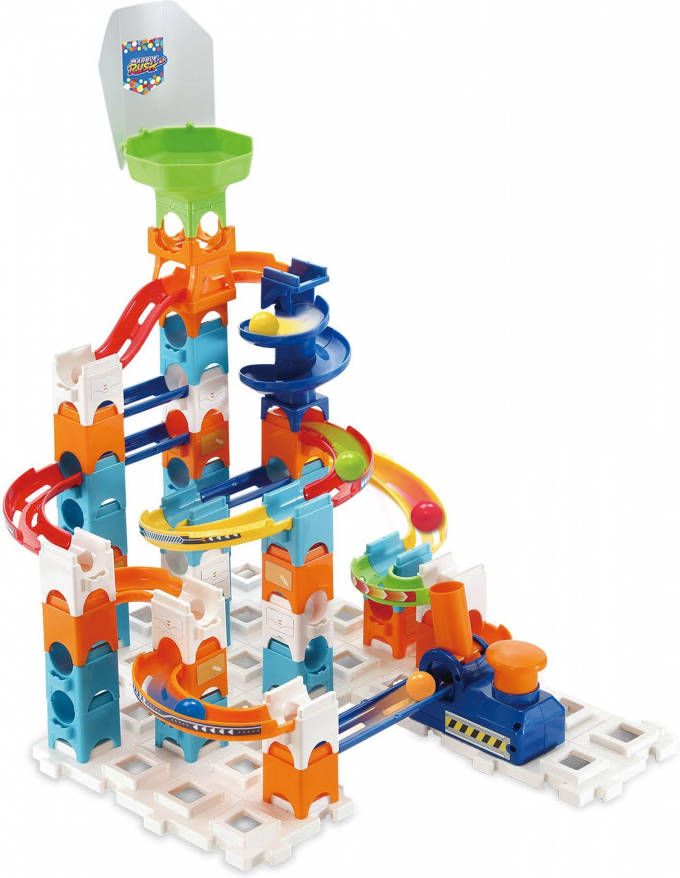 Bouw een uitdagend parcours met de VTech Marble Rush S100 avonturen set. De set bevat 61 onderdelen, waaronder een trechterglijbaan en een lanceerder.